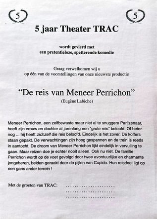 Het amateurgezelschap TRAC viert zijn vijfjarige bestaan met de groots opgezette productie van een luchtig Frans stuk uit 1860. Beroepsacteur Peter Marichael zorgde voor een geslaagde mise-en-scène.